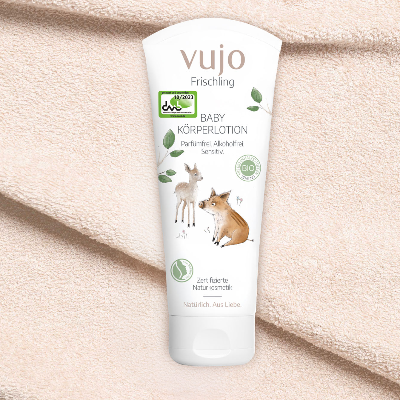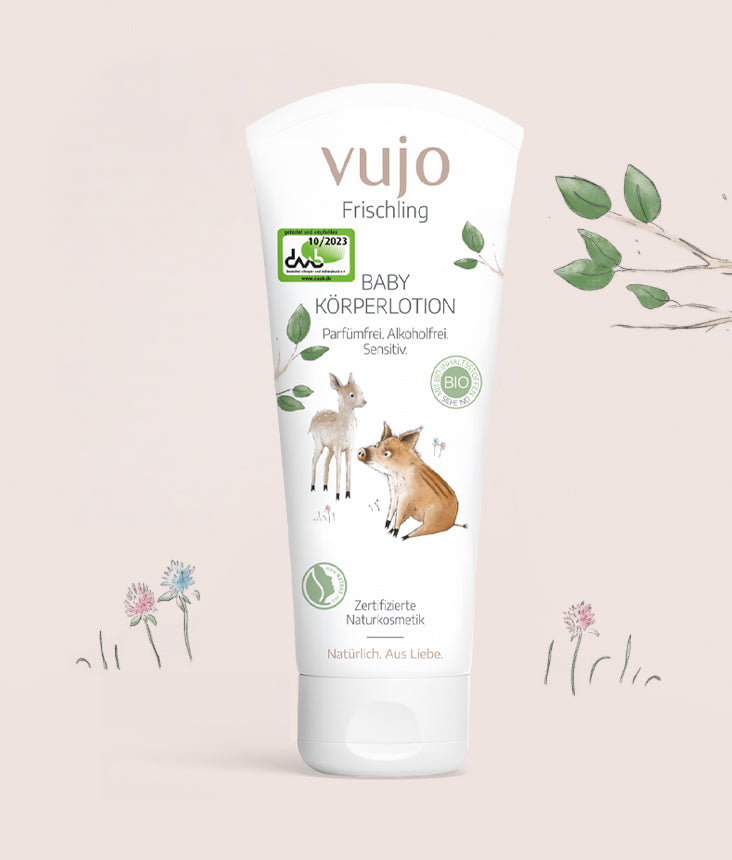 Sie enthalten nur sorgfältig ausgewählte Inhaltsstoffe und sind frei von allergieauslösenden Substanzen. Dermatologische Tests durch unabhängige Institute bestätigen: Alle vujo Frischling-Produkte sind sehr gut verträglich für die sensible Babyhaut!
