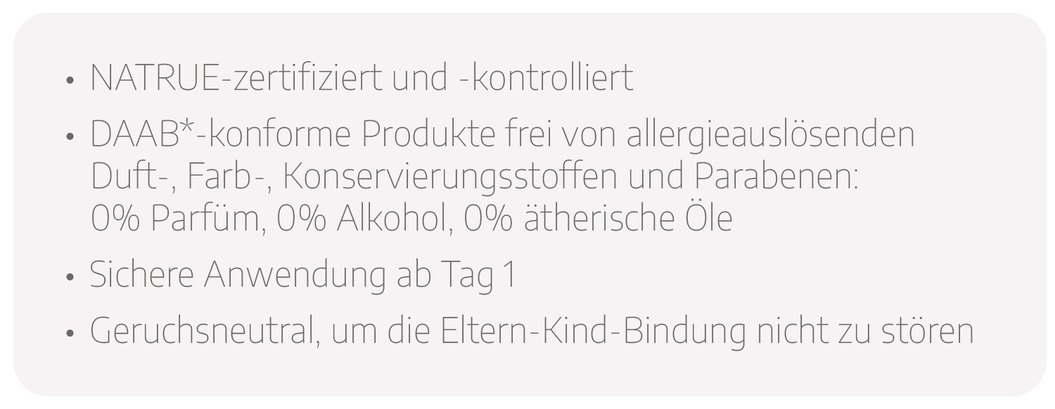 Unsere Babypflege-Serie wurde auf Grundlage wissenschaftlicher Erkenntnisse gemeinsam mit Dermatologen in Deutschland entwickelt und vom unabhängigen Institut ‚Dermatest‘ nicht nur auf normaler Haut (Standard-Test), sondern speziell auf sensibler Haut getestet. Das Ergebnis: die Bewertung „sehr gut“. Alle Produkte können mit Sicherheit ab Tag 1 für die sensible, zu Neurodermitis neigende Baby- und sogar Erwachsenenhaut empfohlen werden. Sie sind frei von allergieauslösenden Duft-, Farb-, Konservierungsstoffen und Parabenen und unterstützen so eine intensive Eltern-Kind-Bindung.